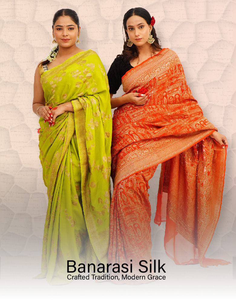 We sell a range of clothes and provide all kinds of Indian wear at the best prices possible. Our clothing ranges from sarees, suits and lehengas to interior design segments. We are also renowned for selling art silks, art silk sarees online, georgette printed sarees, blended Banaras fabrics, pure handloom and pure powerloom artistic sarees wholesaler & manufacturers in Varanasi, India.